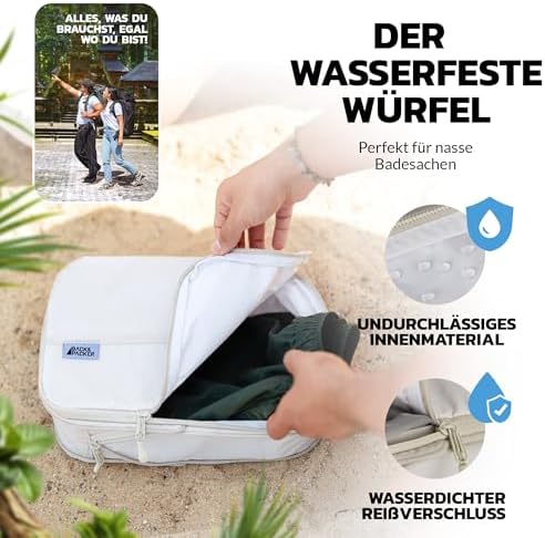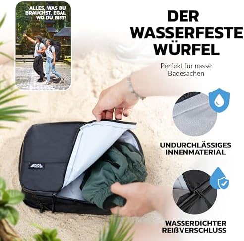 🌍 NASSE WÄSCHE? KEIN PROBLEM! – Durch den wasserfesten Packwürfel (30cm x 20cm x 10cm unkomprimiert) kannst du problemlos nasse Badekleidung oder Handtücher verstauen. Der Rest bleibt trocken, garantiert!