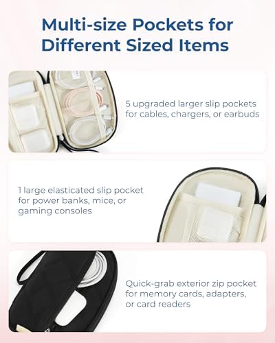Halten Sie alles organisiert – Dieser zweilagige Reisekabel-Organizer verfügt über mehrere Taschen in verschiedenen Größen. Er hat 5 verbesserte, größere Einschubtaschen für Ladegeräte, Kabel oder Flash-Laufwerke. Zwei große, elastische Einschubtaschen enthalten Powerbanks und Mäuse. Eine größere Tasche mit Klettverschluss verhindert, dass Gegenstände wegfliegen, und es gibt auch eine Außentasche mit Reißverschluss für Ohrhörer, Schlüssel und kleine Gegenstände.