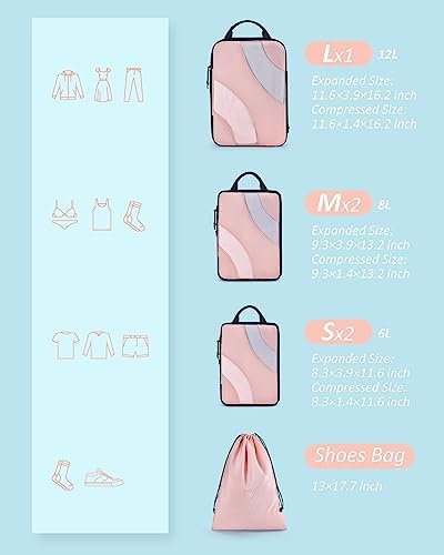 Was Sie erhalten: BAGSMART 6 Set Kompressions-Verpackungswürfel enthalten 1 großen Würfel (29,6 x 32,6 cm), 2 mittelgroße Würfel (24,6 x 33,2 cm), 2 kleine Würfel (21,6 x 29,6 cm) und einen Schuhbeutel mit Kordelzug (33 x 45 cm). Verpackungs-Organizer in verschiedenen Größen eignen sich für verschiedene Verpackungszwecke.