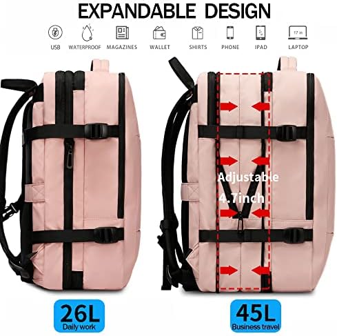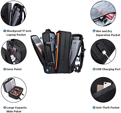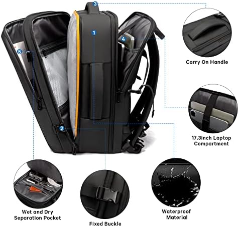 Unser Rucksack bietet großzügige Kapazität und viele Fächer für gut organisierte Reisen. Das Hauptfach bietet Platz für Ihre Reiseutensilien und passt 5–8 Kleidungsstücke auf. Eine nasse Tasche bietet zusätzlichen Schutz für Flüssigkeiten, und das vordere Fach bietet Platz für Zeitschriften, iPad und Bücher sowie eine Powerbank zur Aufladung Ihres Telefons. Das Laptopfach ist für 43,2 cm (17 Zoll) Lahmtiere geeignet, hat eine Größe von 38,9 x 29 cm und ist gepolstert, um Ihren Laptop zu schützen.