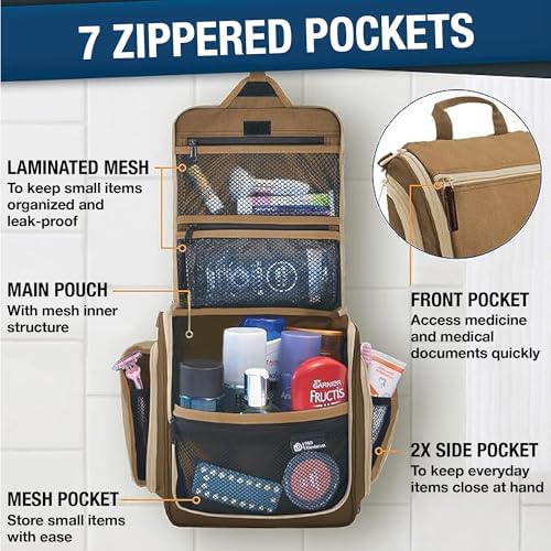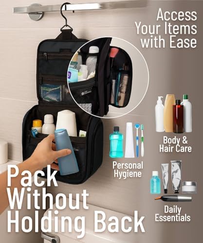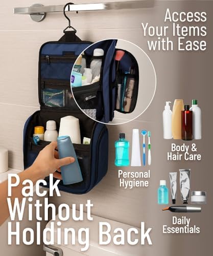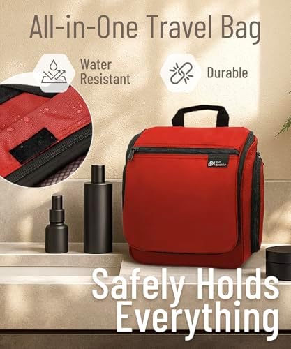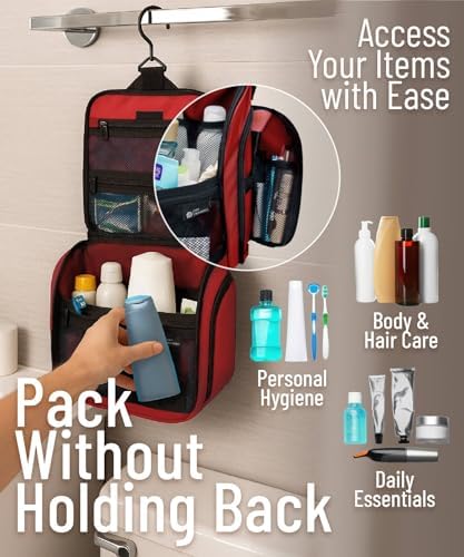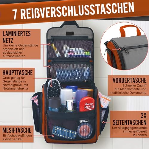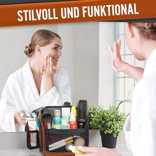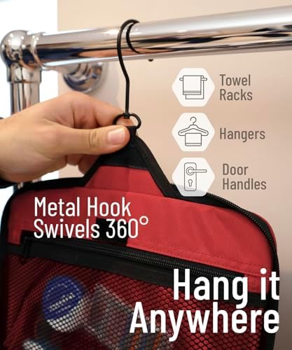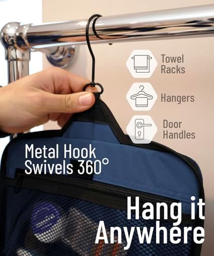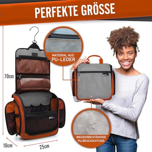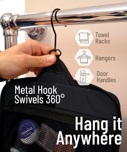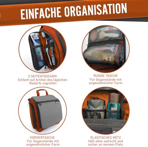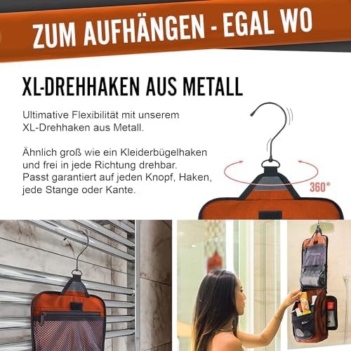 LÄSST SICH ÜBERALL AUFHANGE: Auf Reisen wissen Sie nie genau, wie Ihr Badezimmer aussieht. Jedes ist anders, und mit unserer Tasche sind Sie auf alles vorbereitet. Unser Produkt wird mit einem XL-Metall-Drehhaken geliefert, der es einfach macht, diese überall aufzuhängen und die Abstellflächen frei von einer Unordnung zu halten. Sie können diesen vielseitigen Kulturbeutel für den Duschraum, im Fitnessstudio, Hotelübernachtung oder für eine längere Rucksacktour verwenden.