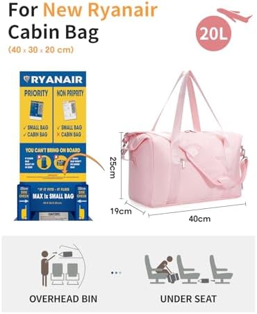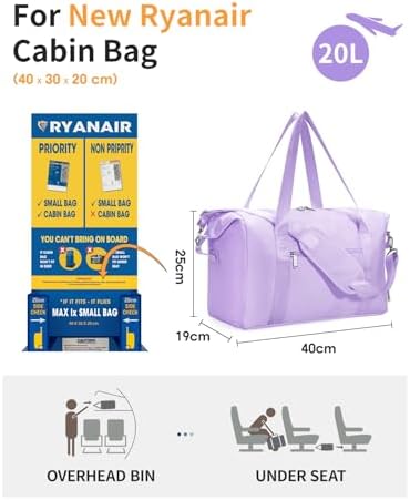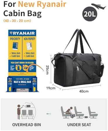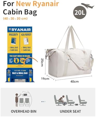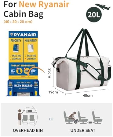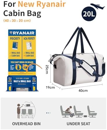 Die Taschengröße von 40 x 19 x 25 cm (Fassungsvermögen 20 l) passt perfekt in die kleine Handgepäcktasche der Ryanair Airlines mit der Größe 40 x 20 x 25 cm, die sich Ihren Sitz unterlegen lässt und dafür keine zusätzliche Gebühr zu zahlen ist.