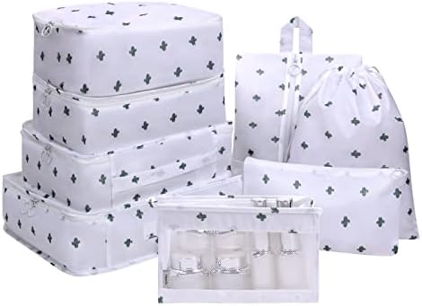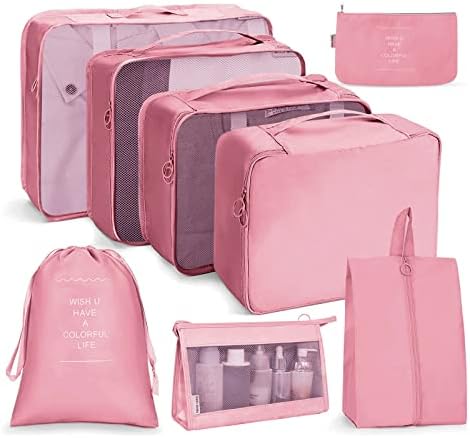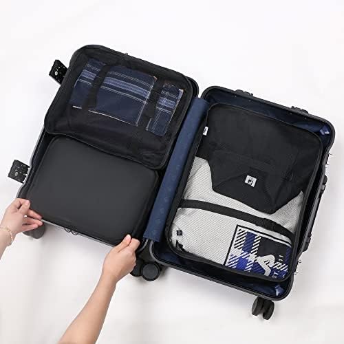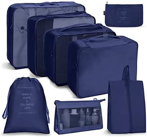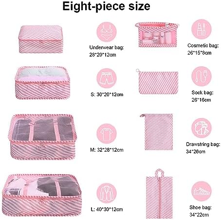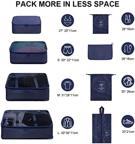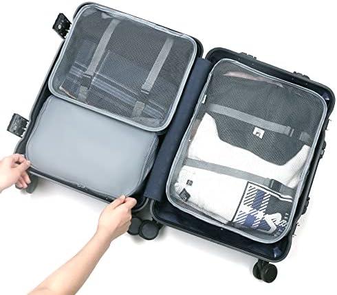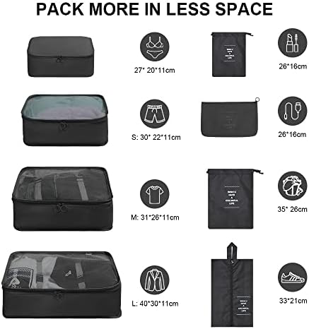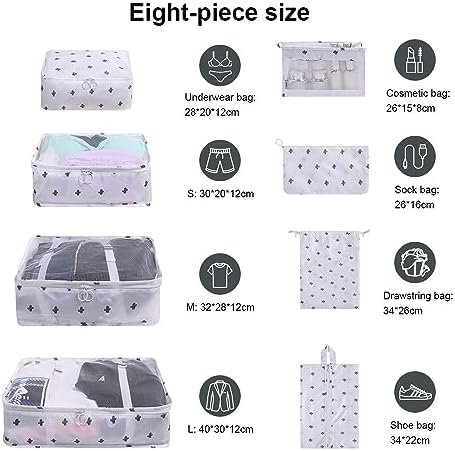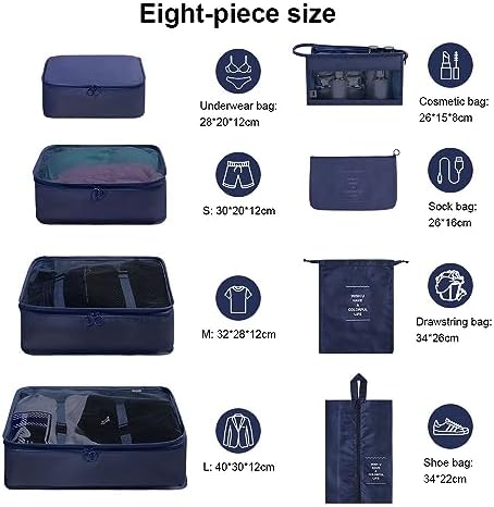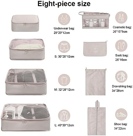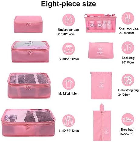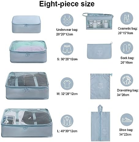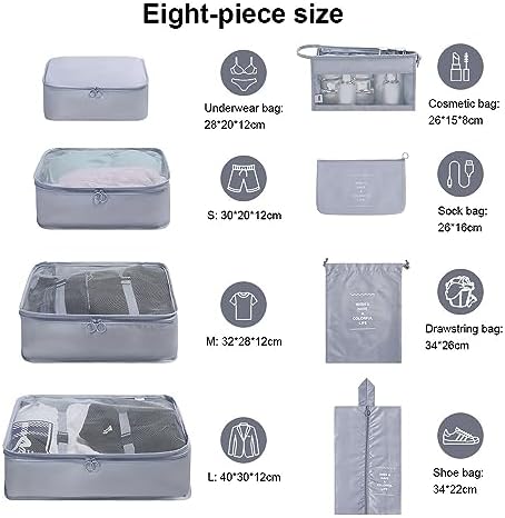 Das Set besteht aus 3 durchsichtigen Packkästen, einem geheimen Kasten für BHs und Unterwäsche, einer Reisetasche für Schuhe, einer Toilettenpouch, einem Waschbeutel für schmutzige Kleidungsstücke sowie einem ebenen Taschenfach für kleinere Gegenstände wie Socken oder Elektronikgeräte.