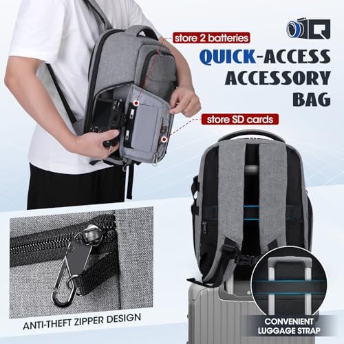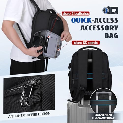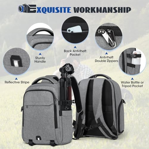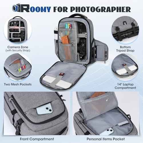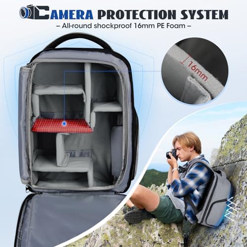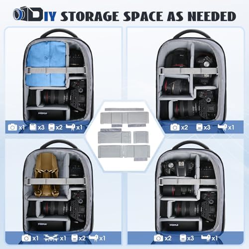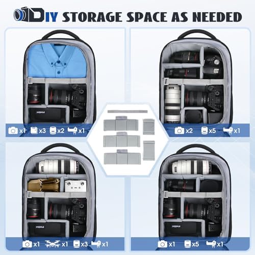 Versatile Trennwände: Der Kamerarucksack bietet fünf herausnehmbare, gepolsterte Trennwände, ideal für verschiedene Kameras und Zubehör, ob es sich um DSLR, 3 bis 5 Objektive oder Zusatzgeräte handelt. Die verschiebbaren Trennwände sichern Ihre Ausrüstung flexibel und verhindern Kratzer.