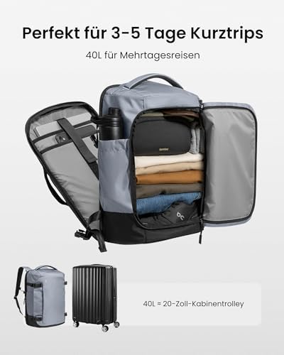 Großer Herrenrucksack: Volumen: 40 Liter (Wegnehmbares Fassungsvermögen zwischen 38 und 40 Litern). Größe: 52 x 33 x 23 cm. Der Handgepäck-Rucksack bietet genügend Platz für alle wichtigen Reiseutensilien.
